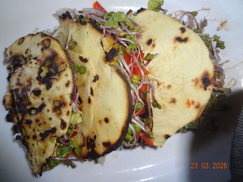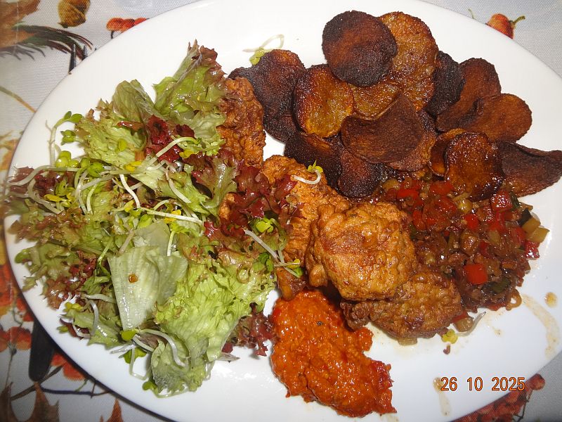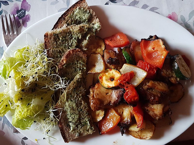 | | Hähnchen im Schlafrock, Ajvar-Schmand-Tomatenmark-Dip, viel zu braune Kartoffelchips, Lollo-Rosso-Salat mit Sprossen |