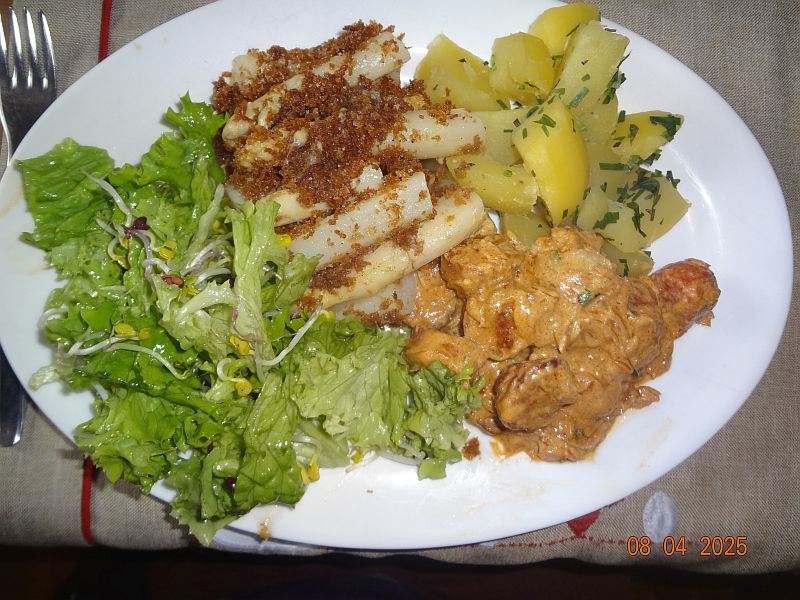 | | Gebratene Salsiccia-Scheiben in Wein-Schmand-Soße, Spargel mit in Butter gerösteten Panko-Bröseln, Pet.-Kart. mit Rosmarin und Schnittlauch, Lollo-Bionda-Salat mit Sprossen |