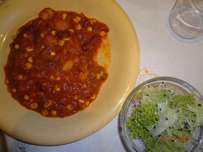 | | Chili con / sin carne, Lollo-Bionda-Salat mit Radieschen-Sprossen |