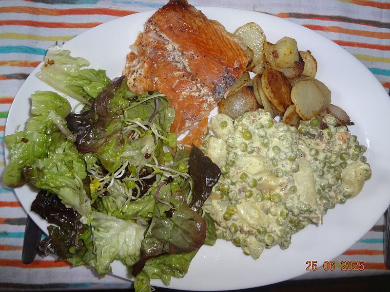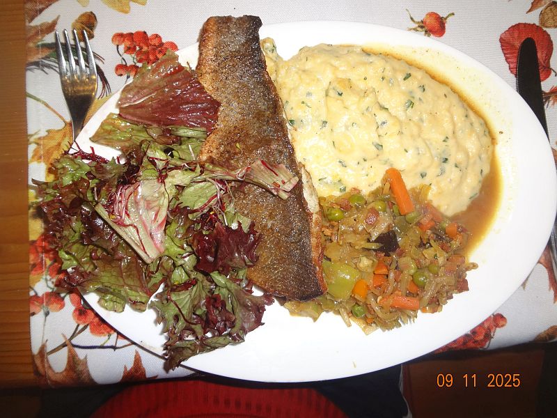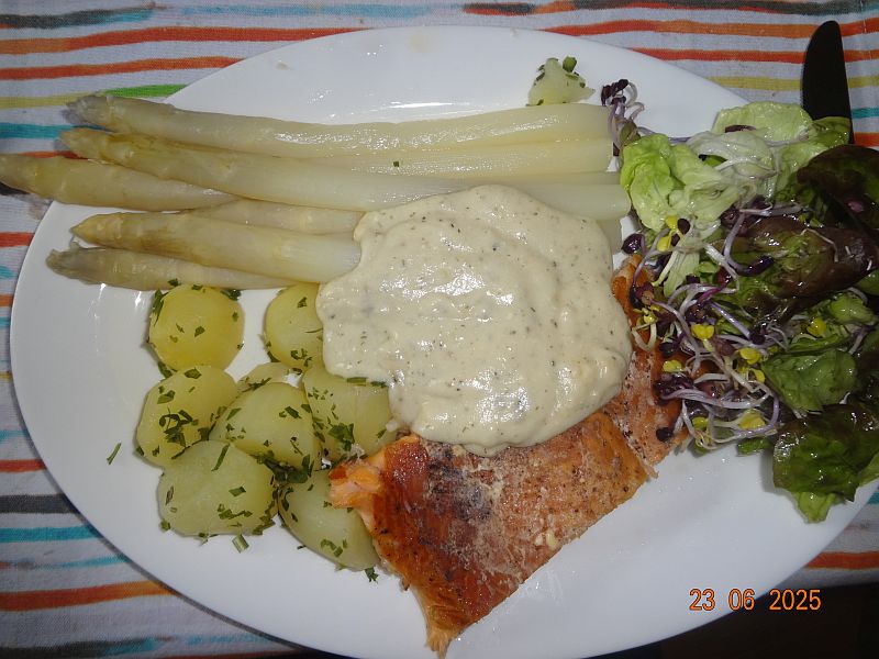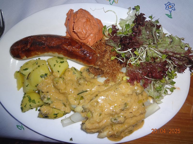 | | Selbstgeräuchertes Lachs-Filet, Spargel und sehr feine Erbsen in Schmand-Soße, Bratkart., Eichblattsalat mit Radieschen-Sprossen |