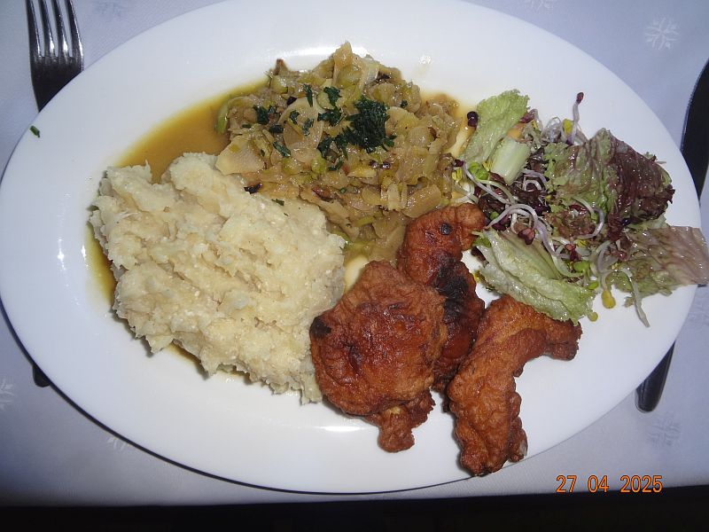 | | Kasseler, Sauerkraut mit Rum-Rosinen, Apfel und Schmand, mit Käse überbacken, Frisée-Salat mit Rotkohl-Sprossen |