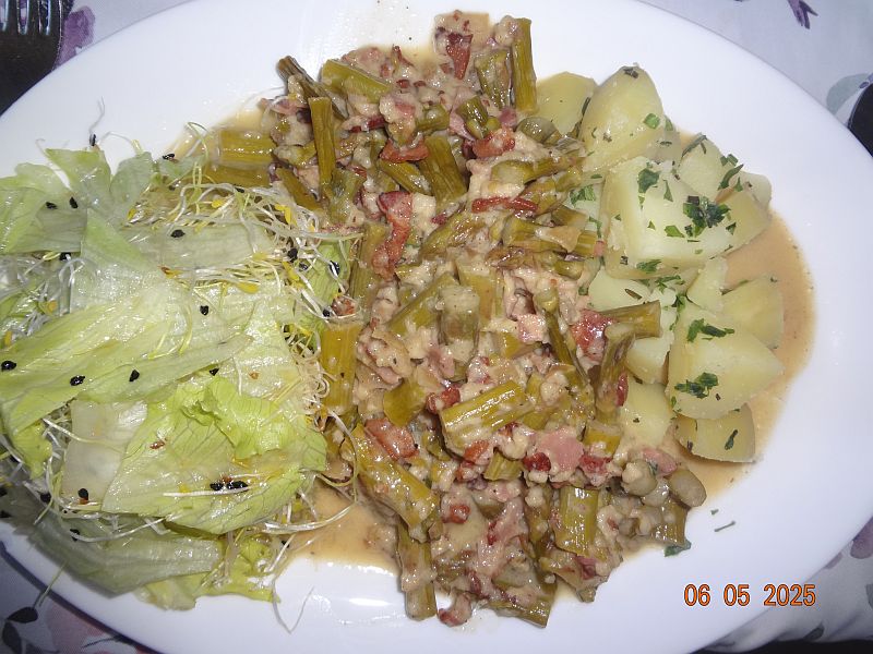 | | Grüner Spargel in einer Soße aus Kochschinken, Bacon, Käse, Zwiebeln, Schmand und Sektreduktion, Pet.-Kart., Eisbergsalat mit Alfalfa-Sprossen |
