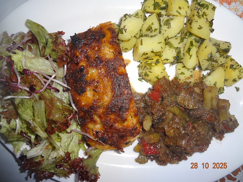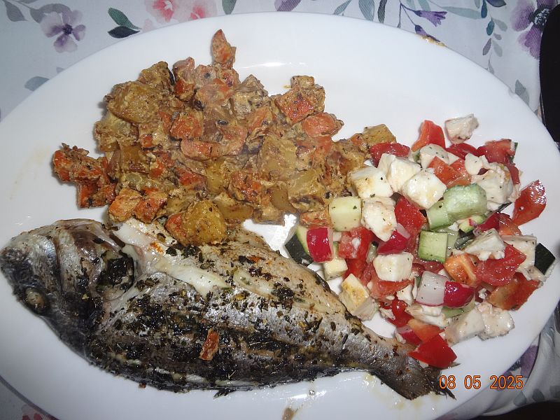 | | Kräuter-Dorade mit Kart. und Möhren, Gemüse-Salat mit Mozzarella |