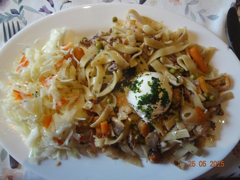 | | Tagliatelle mit Fisch, Meeresfrüchten und gemischtem Gemüse, Weißkohl-Salat mit Paprika-Streifen |