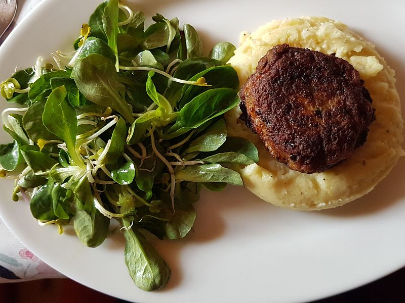 | | Pilz-Fleisch-Klopse mit Käse und Schmand, gebratene Kartoffelspalten, Eichblattsalat mit Alfalfa- und Rettich-Sprossen |