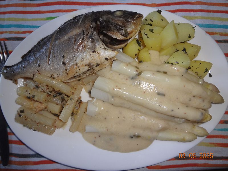 | | Gebackene Dorade, Spargel, Spargelsalat, Pet.-Kart. |