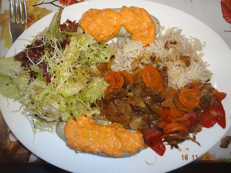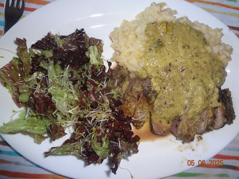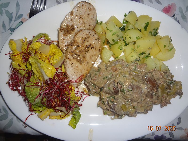 | | Nackensteak, Ajvar-Tomatenmark-Schmand-Dip, Pilz-Gemüse in Sekt-Schmand-Soße, Pet.-Kart., Lollo-Bionda-Salat mit Alfalfa-Sprossen |
