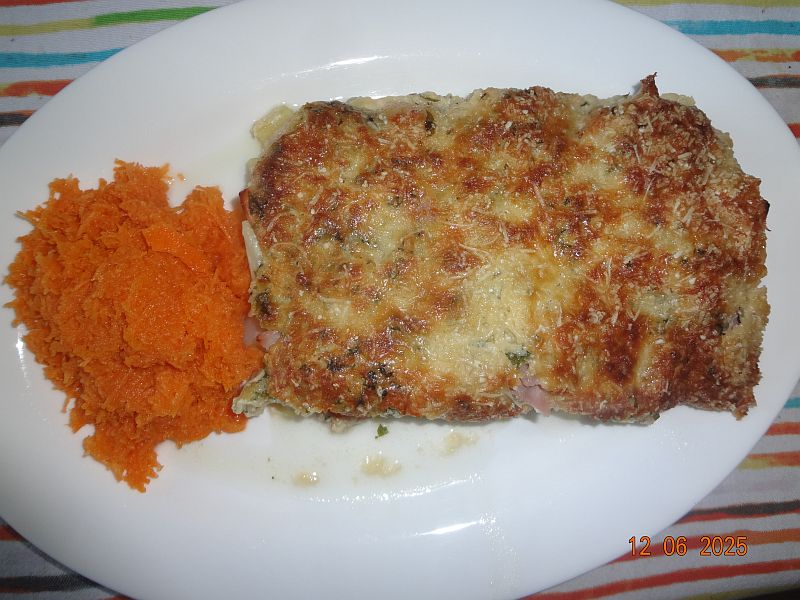 | | Gordon bleu mit Prager Schinken und Chedder-Käse, Blumenkohl, Pet.-Kart., Lollo-Bionda-Salat mit Radieschen-Sprossen |