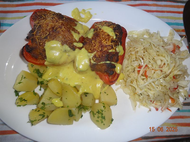 | | Gefüllte Paprikaschoten, Pet.-Kart., Schmand-Curry-Soße, Weißkohlsalat mit Paprikastreifen |