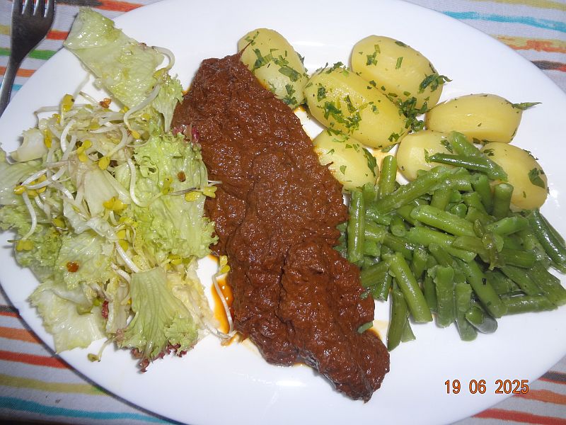 | | Rindergulasch a la Opa, Pet.-Kart., Lollo-Rosso-Salat mit Radieschen-Sprossen |