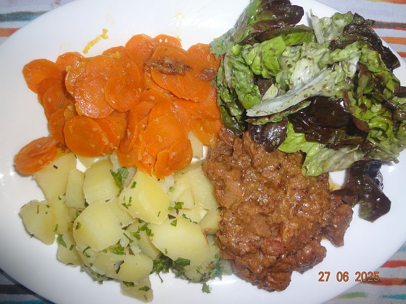 | | Schweinefilet-Gulasch, gehobelte Möhren(*) mit Ahornsirup, Zitrone, Ingwer, Sesam und Apfelsaft, Rosm.-Kart., Eichblattsalat mit Kräutern |