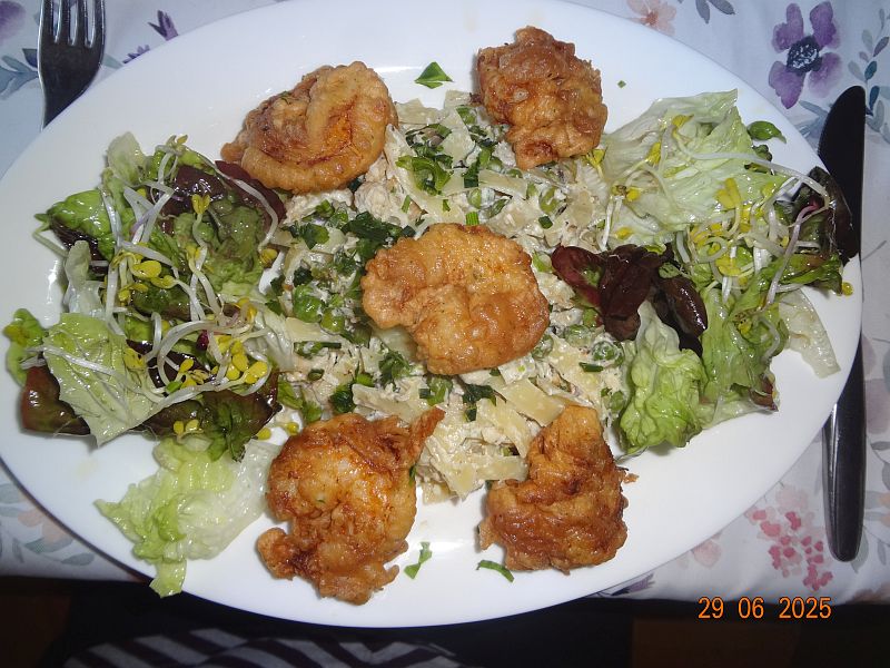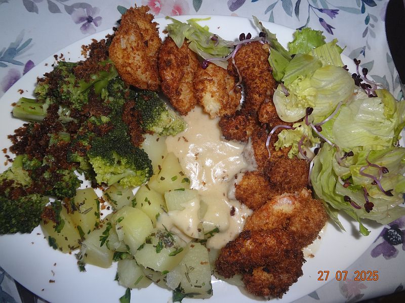| | Gegrillte, panierte Garnelen, gedünsteter Broccoli mit Bröseln, Sekt-Schmand-Soße, Pet.-Kart. (*), Eisbergsalat mit Radieschen-Sprossen |