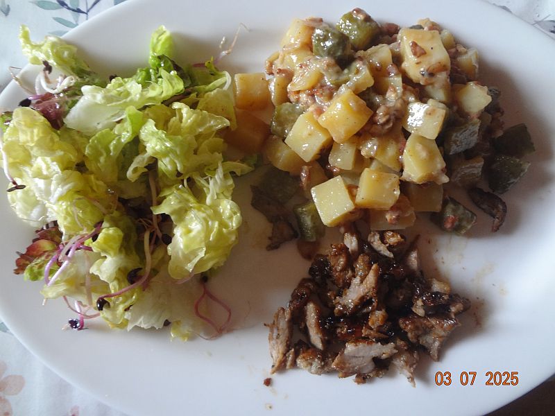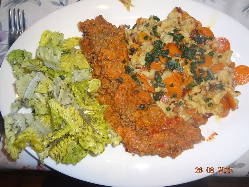 | | Auflauf aus gehobelten Kart., gebratenem Bacon, Zwiebeln, Paprika, Ajvar, dünnen Nackensteak-Scheiben und geriebenem Käse, Gemüse-Salat mit Mozzarella |