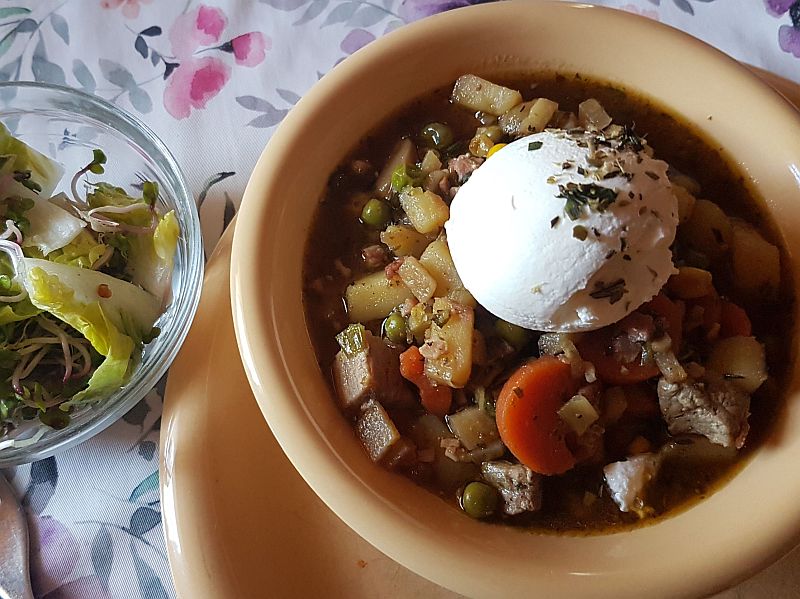 | | Eintopf mit 5 Kräutern und 8 Gemüsesorten in Rinderbrühe, Kart., Schweinefleisch und Schmand, Eichblattsalat mit China-Rose-Sprossen |