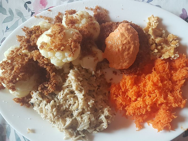 | | Paniertes Schweine-Filet mit Tomaten-Ajvar-Dip, Blumenkohl mit Panko-Bröseln, Basmatireis, in Rinderbrühe gegart, Möhrensalat |