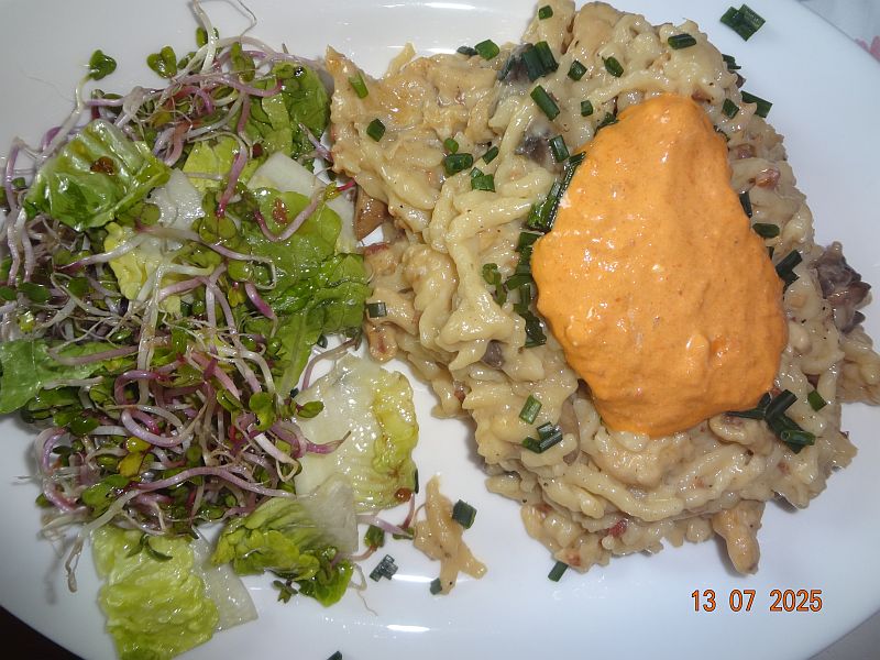 | | Spätzle mit sehr dünn (2mm) geschnittenen Hähnchenfilet-Scheiben, Bacon, Champignons, Zwiebeln, geriebenem Käse, Rinderbrühe und Sektreduktion, Schmand-Ajvar-Tomaten-Dip, Salatherzen mit Alfalfa-Sprossen |