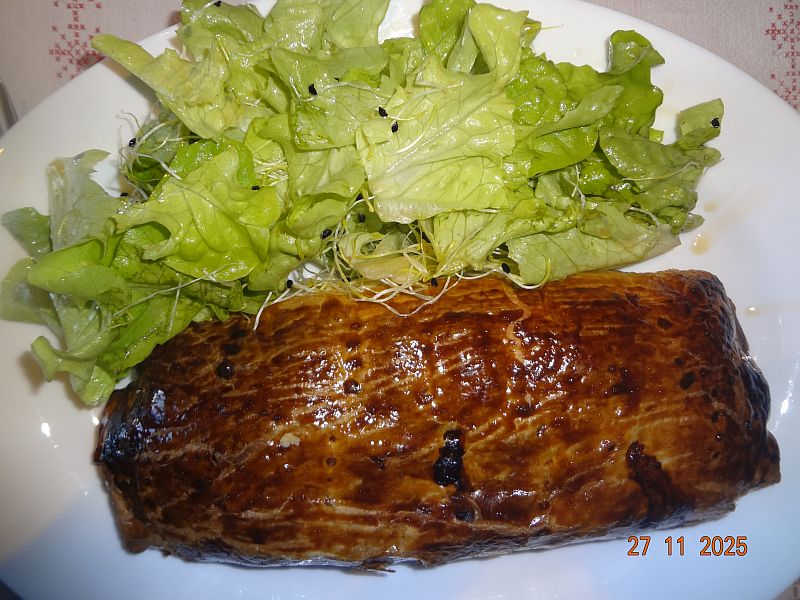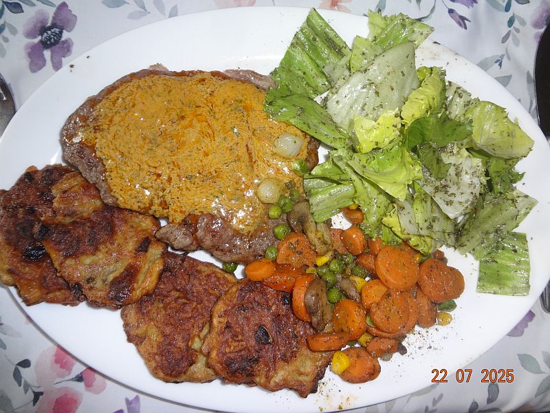 | | Entrecôte mit café-de-pari-Butter, Kart.-Puffer, französisches Mischgemüse, Eisbergsalat mit Salatkräutern |