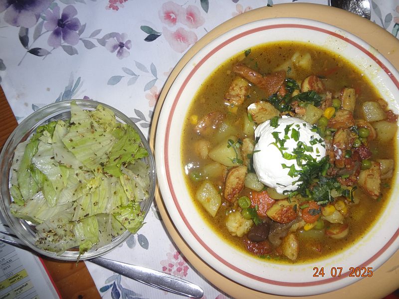| | Eintopf in Rinderbrühe mit Bratwurst-Würfeln, Garnelen, Waldpilzen, gemischtem Gemüse, Bacon, und Zwiebeln (*), Eisbergsalat mit Kräutern der Provènce |