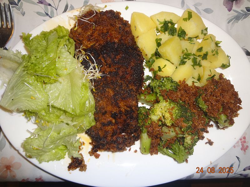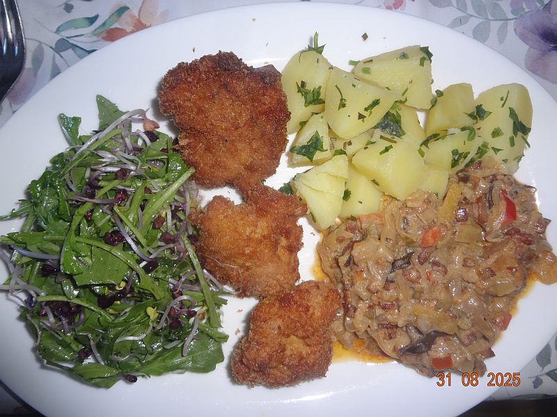| | Paniertes Hähnchenbrust-Filet, gemischtes Gemüse mit Waldpilzen, Pet.-Kart, Rucola-Salat mit Radieschensprossen |