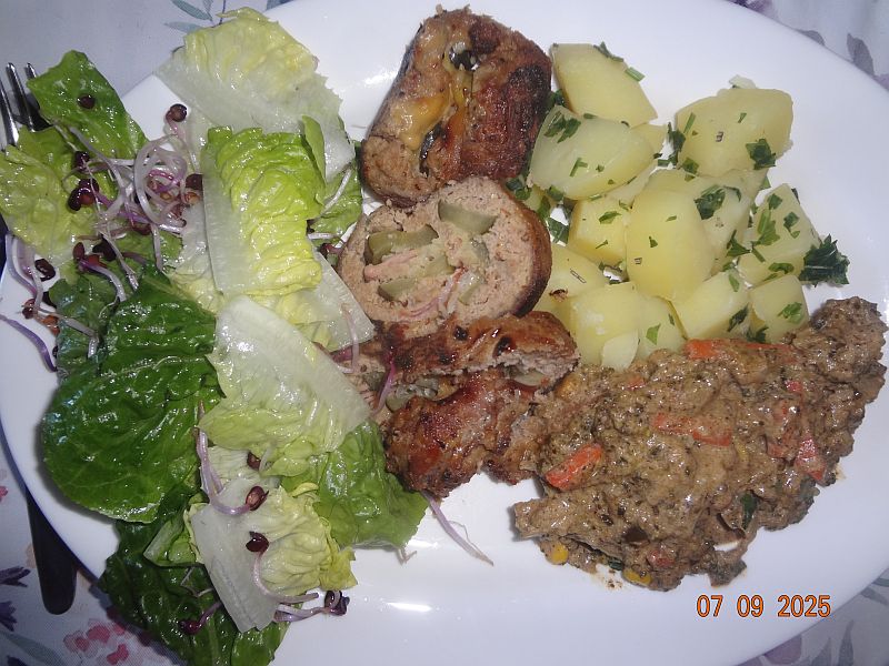 | | Schweinenacken-Roulade, Weißkohl mit Paprika-Streifen, Pet.-Kart., Tomate-Gurke-Mais-Salat mit Mozzarella |