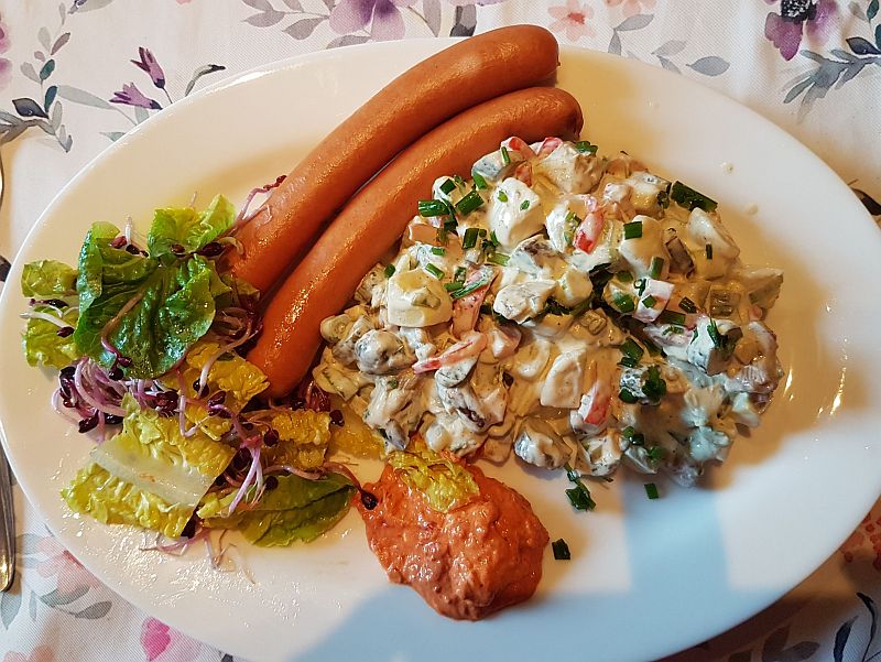 | | Schleizer Würstchen, Kart.-Salat mit Mayonnaise, Möhren, Cornichons, Zucchini, Waldpilzen, Paprika und Lauchzwiebeln, Dip, Mini-Romana-Salat mit Radieschen-Sprossen |