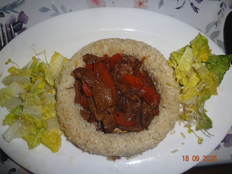 | | Rindfleisch-Hackbraten, Asia-Gemüse, Pet.-Kart., Lollo-Rosso-Salat mit Rote-Bete-Sprossen |