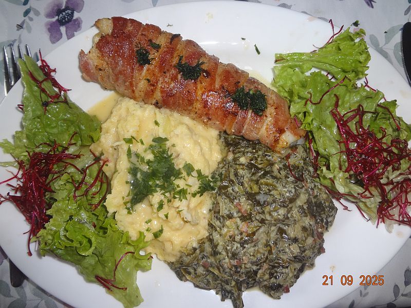 | | Schollenfilet im Speckmantel, Spinat mit Speck und Zwiebeln, Kart.-Sellerie-Püree mit Käse und Schmand, Lollo-Bionda-Salat mit Rote-Bete-Sprossen |