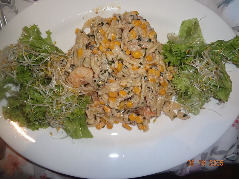 Tagliatelle mit Garnelen, Gemüsemais und Kräutern in cremiger Alfredo-Soße, Lollo-Bionda-Salat mit Alfalfa-Sprossen |