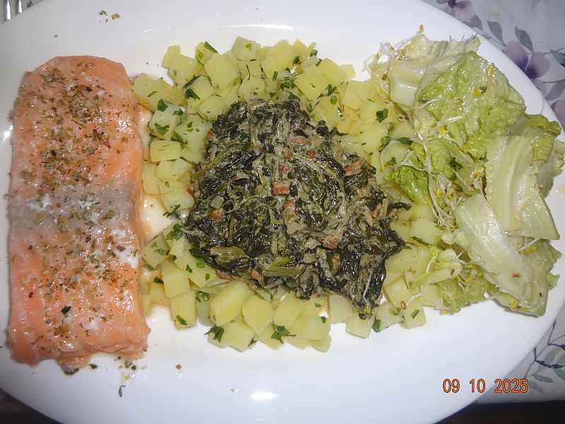 | | Vakuumiertes Lachs-Filet, Rahmspinat, Rosmarin-Kart. mit Pet., Lollo-Bionda-Salat mit Alfalfa-Sprossen |