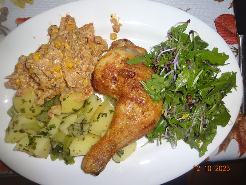 | | Hähnchen-Schenkel aus der Heißluft-Fritteuse, Farmers-Gemüse mit Sekt-Schmand-Creme, Pet.-Kart. mit Sellerie, Rukola-Salat mit Sprossen |