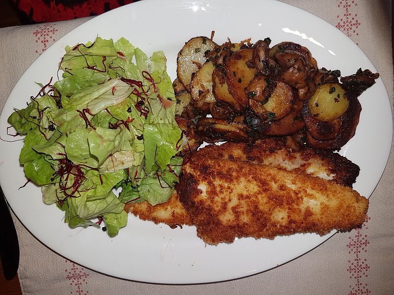 Paniertes Schollenfilet, Bratkartoffeln mit Champignons, Eichblattsalat mit Rote-Bete-Sprossen |