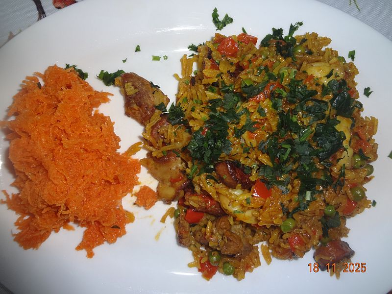| | Paella mit Hähnchenfleisch, Chorizo und Garnelen, Möhrensalat |