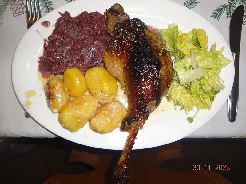 | | Gänsekeule, Apfelrotkohl, glasierte Kartoffeln und Salatherzen mit Alfalfa-Sprossen |