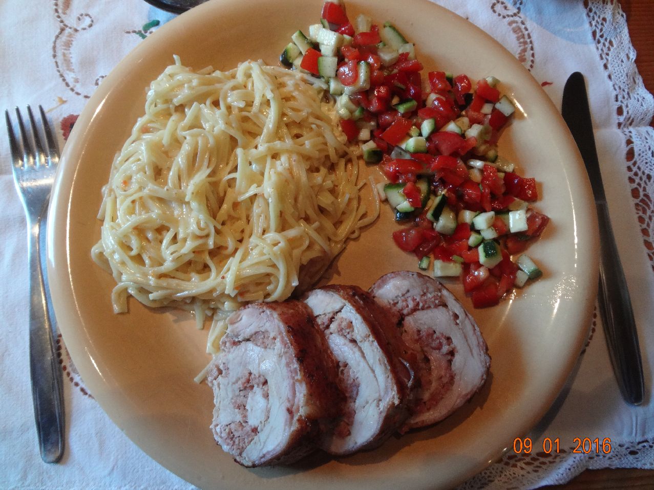 Gefülltes Schwein-Filet im Speck-Mantel mit Nudeln und Tomate-Paprika-Zuccini-Salat