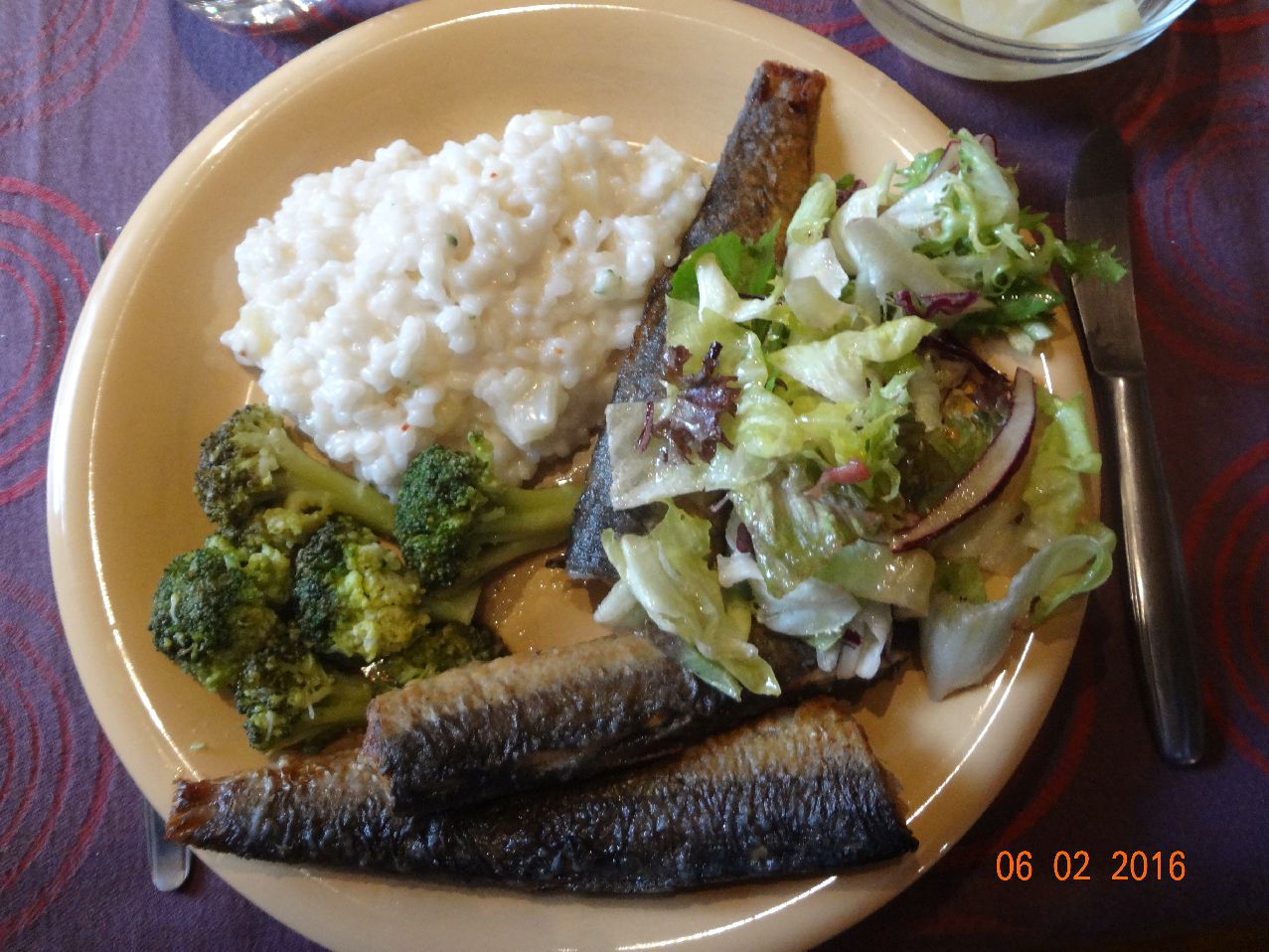 Gebratener Hering mit Pina-Colada-Risotto, gedämpfter Brokkoli und Salat-Mix