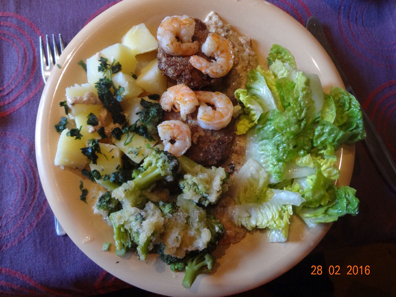 Bratklops mit Riesen-Garnelen, Brokkoli, Käse-Soße und Rosm-Kart, Mini-Romana-Salat