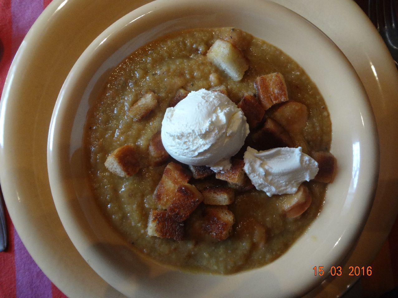 Erbsenpüree-Suppe mit Wiener Würstchen und Croutons
