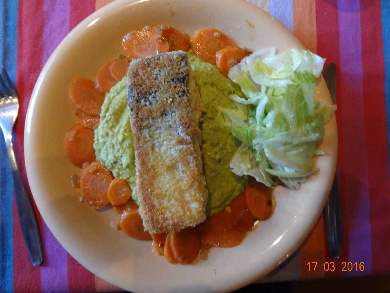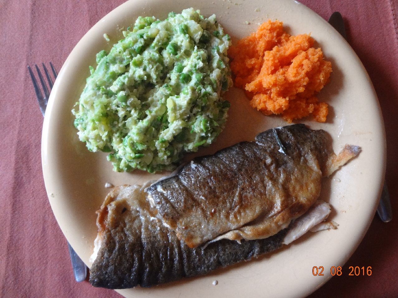 Gebratene Forellen-Filets mit Erbsen-Kartoffel-Stampf und Möhren-Salat