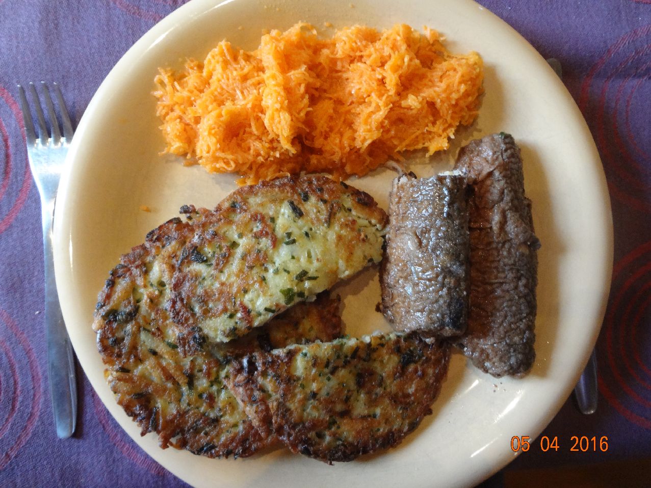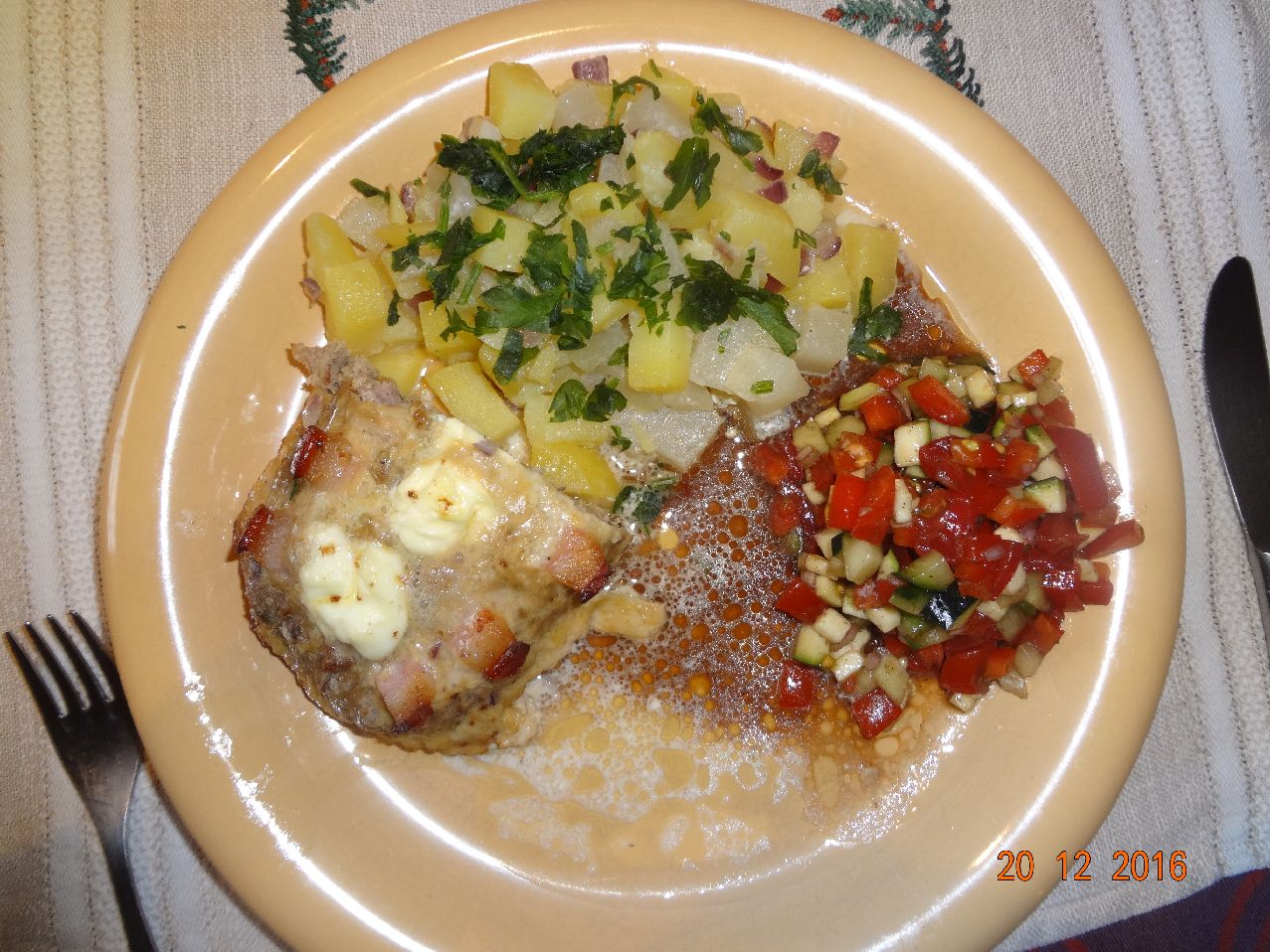 Bratkartoffeln mit mexikanischem Pfannen-Gemüse, Hähnchen und Nacken-Steak im Schlafrock, MöSa