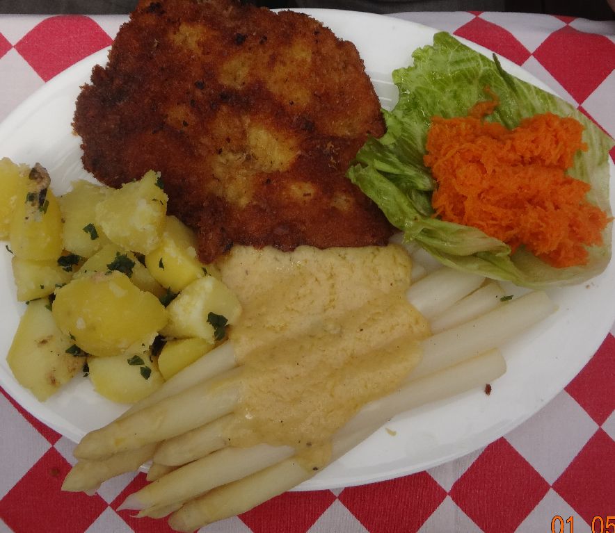 Hähnchen-Schnitzel mit Spargel, Petersilien-Kartoffeln und Feld-Salat