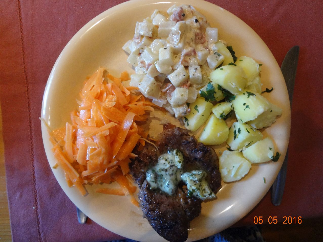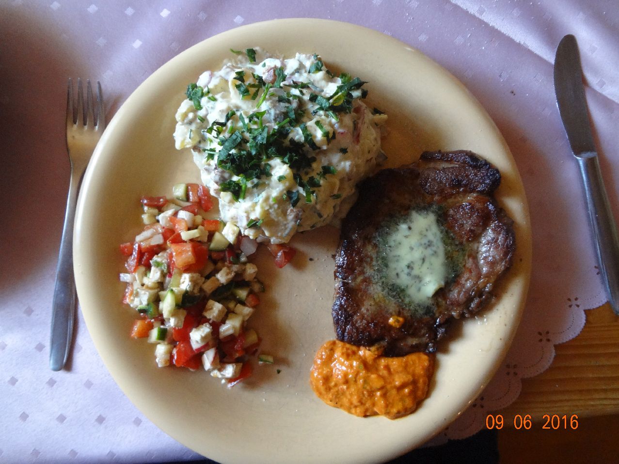 Mariniertes Nacken-Steak mit Kräuter-Butter und eigenem Dip, Kartoffel-Salat, Tomate-Feta-Salat