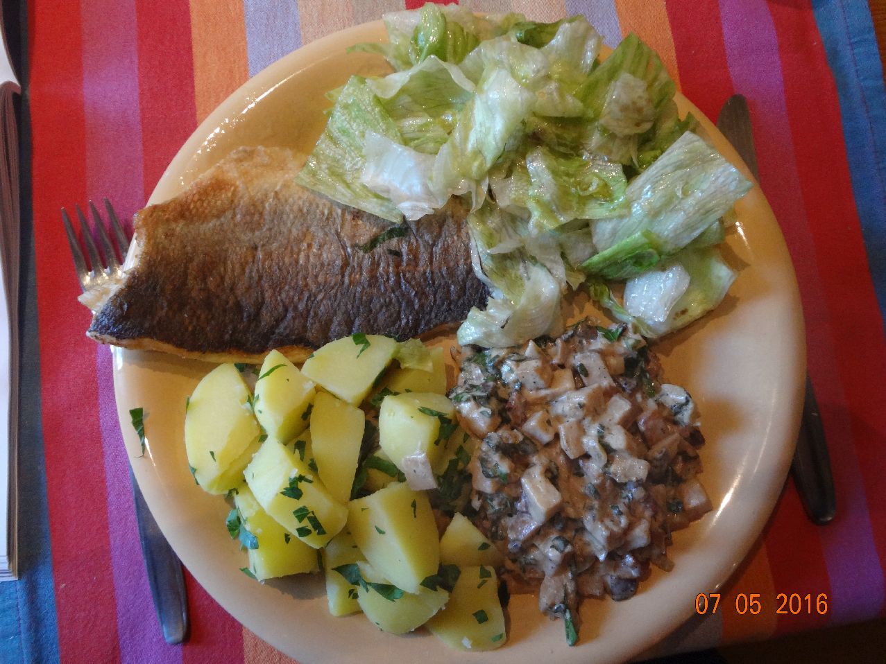 Gebratenes Wolfsbarsch-Filet mit Kräuter-Saiblingen in Sekt-Rahm-Soße und Pet-Kart, Feldsalat