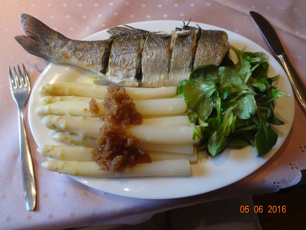 Gebratener Wolfsbarsch, Spargel und Feld-Salat