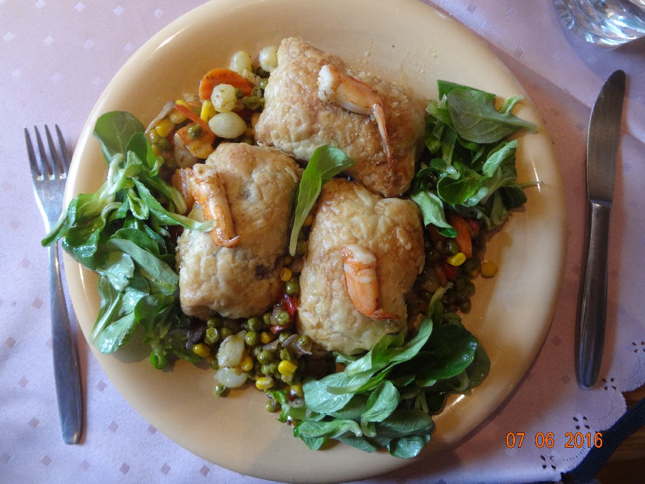 Räucheraal und Garnelen auf Bratkartoffeln mit Pfannen-Gemüse, Eisberg-Salat