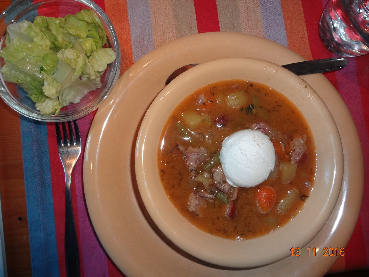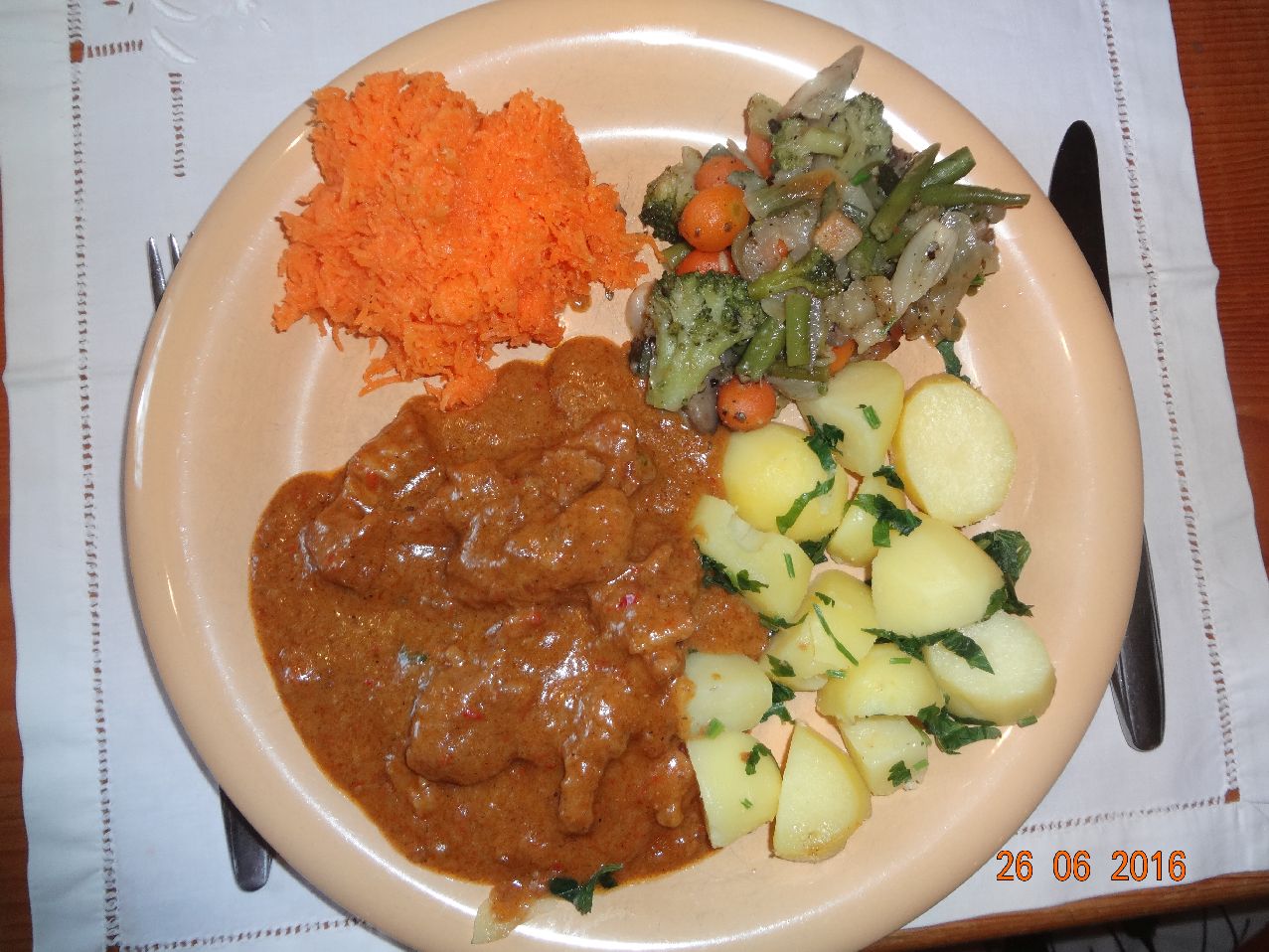 Gulasch, grüne Bohnen, Kartoffeln, Möhren-Salat