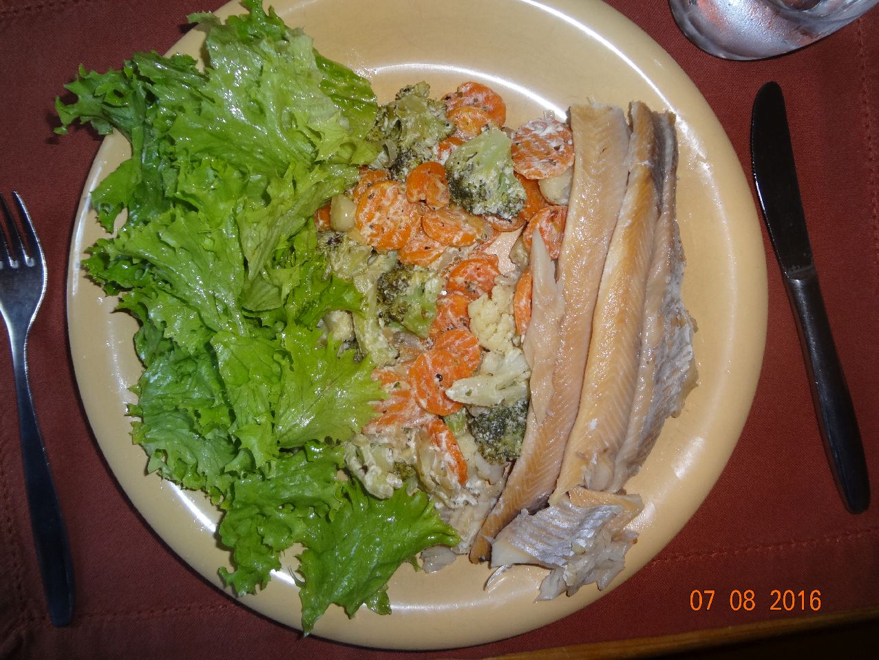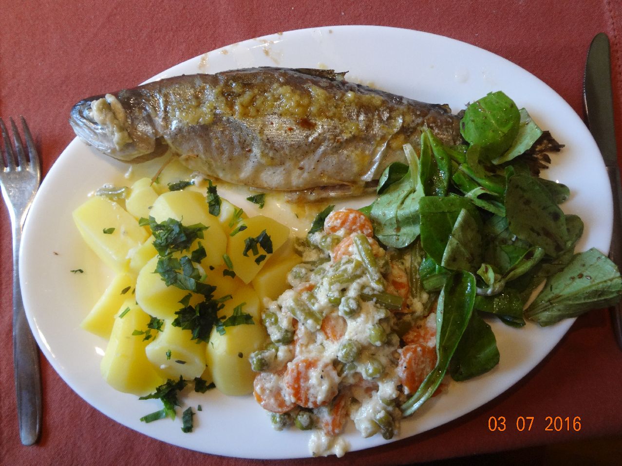 Gegrillte Forelle, Sommer-Gemüse in Weißwein-Schmand-Soße und Thymian-Rosmarin-Kartoffeln, Feld-Salat