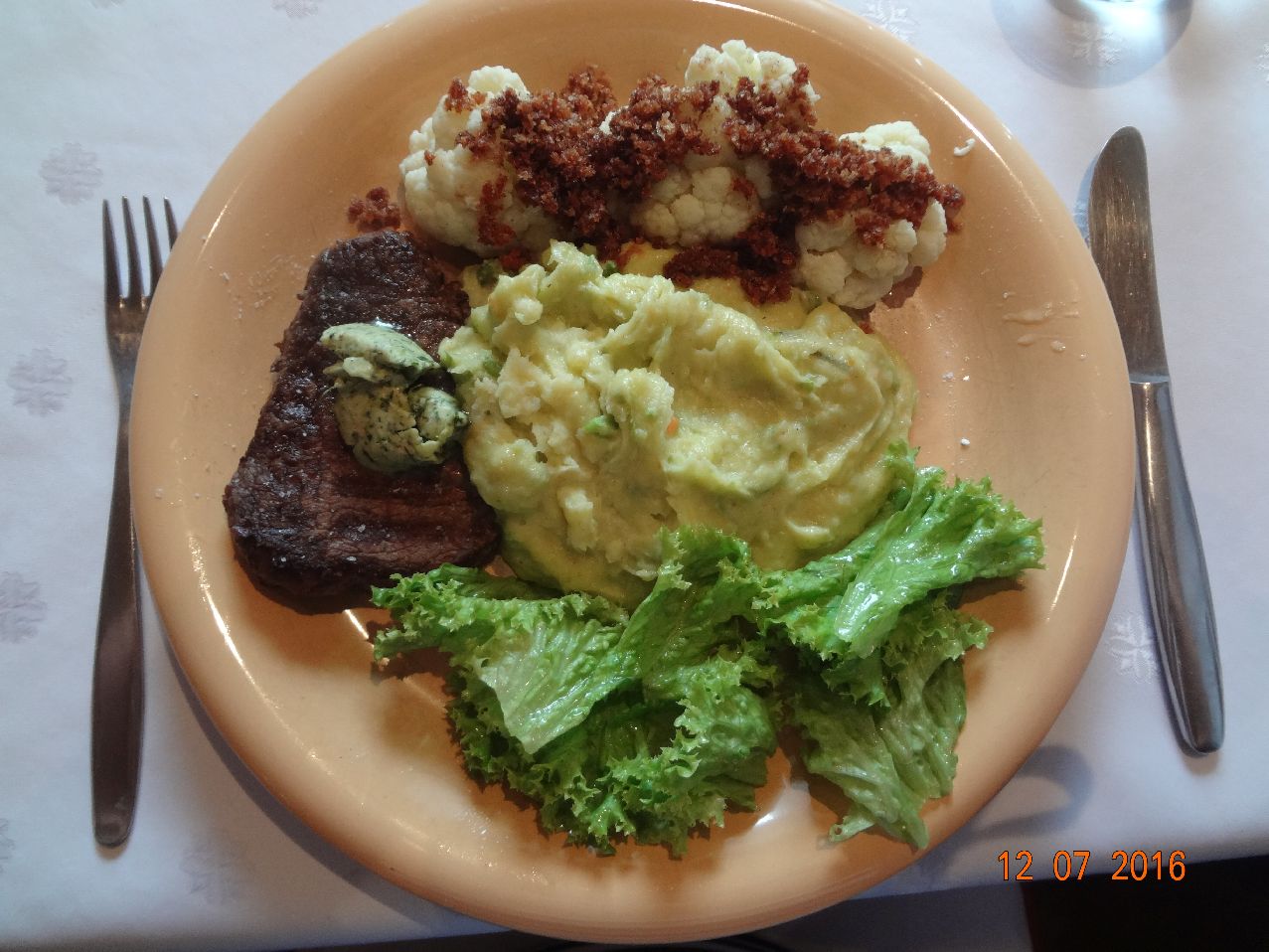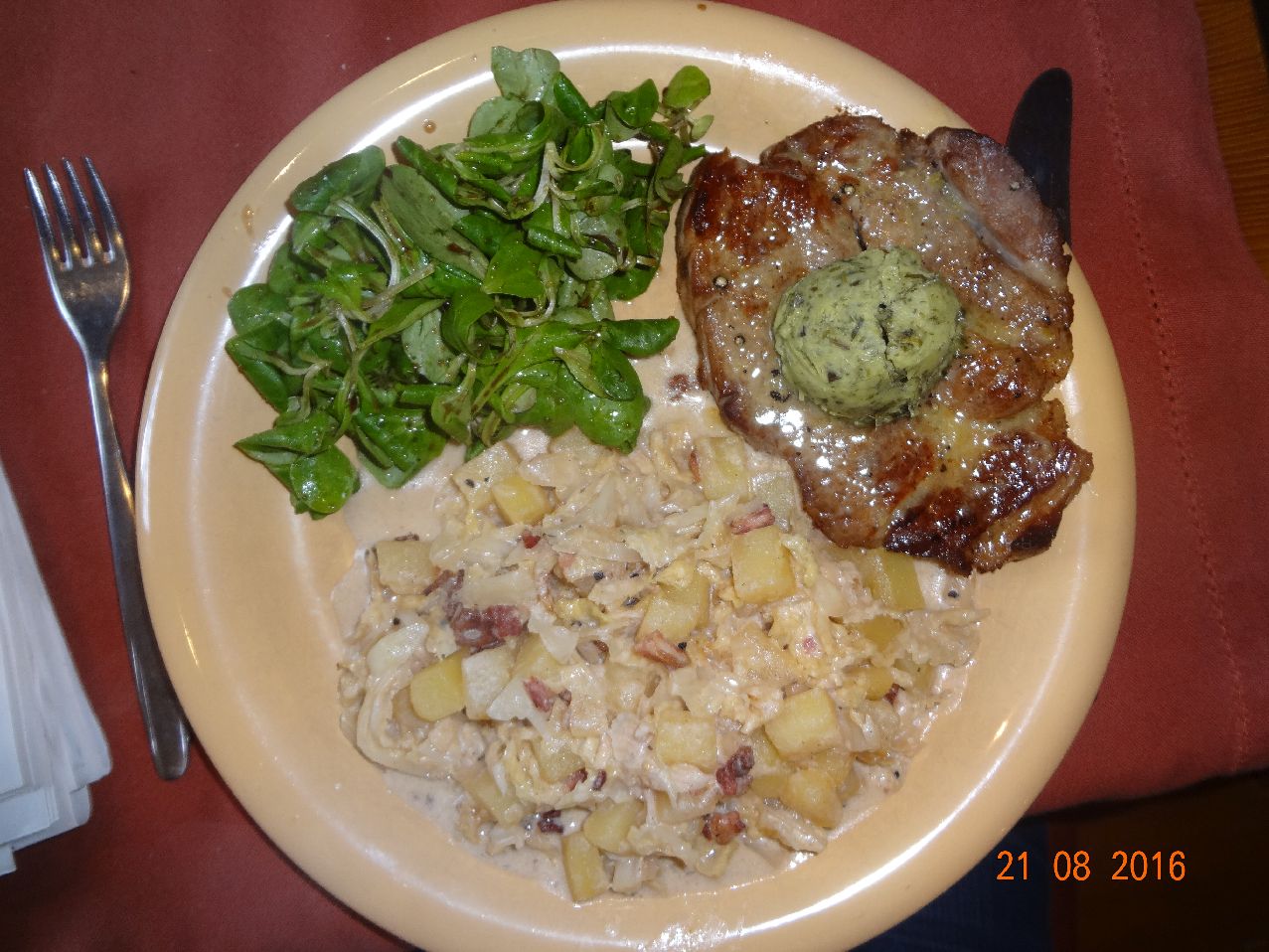 Nacken-Steak mit Kräuter-Butter auf Kartoffel-Wirsing-Gemüse, Feld-Salat