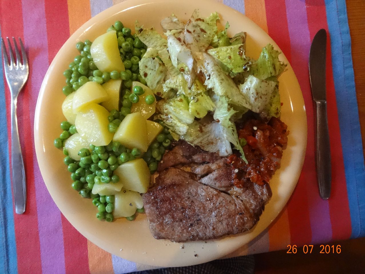 Mariniertes Nacken-Steak mit Kartoffeln und sehr feinen Erbsen, SalaRico-Salat