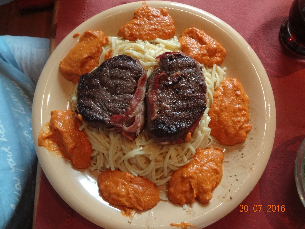 Landnudeln, Steak und Gemüse-Püree-Soße