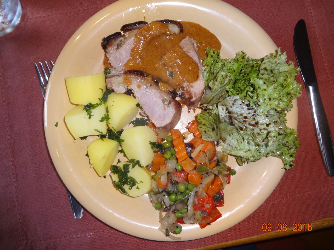 Roastbeef vom Jungbullen in Weißwein-Sahne-Soße, Kaiser-Gemüse, Petersilien-Kartoffeln, Eisberg-Salat
